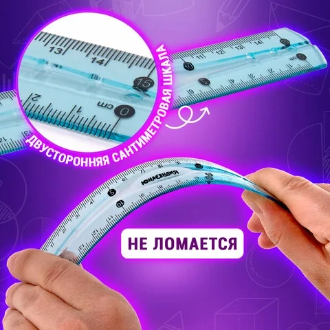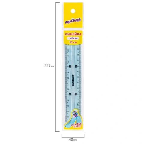 Изготовлена из гибкого прозрачного тонированного пластика голубого цвета. Линейка имеет двустороннюю сантиметровую шкалу и четкую разметку, что делает ее удобной в использовании. Длина шкалы составляет 15 см. Упакована в пластиковый пакет с подвесом.