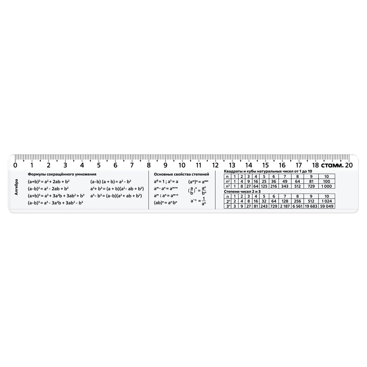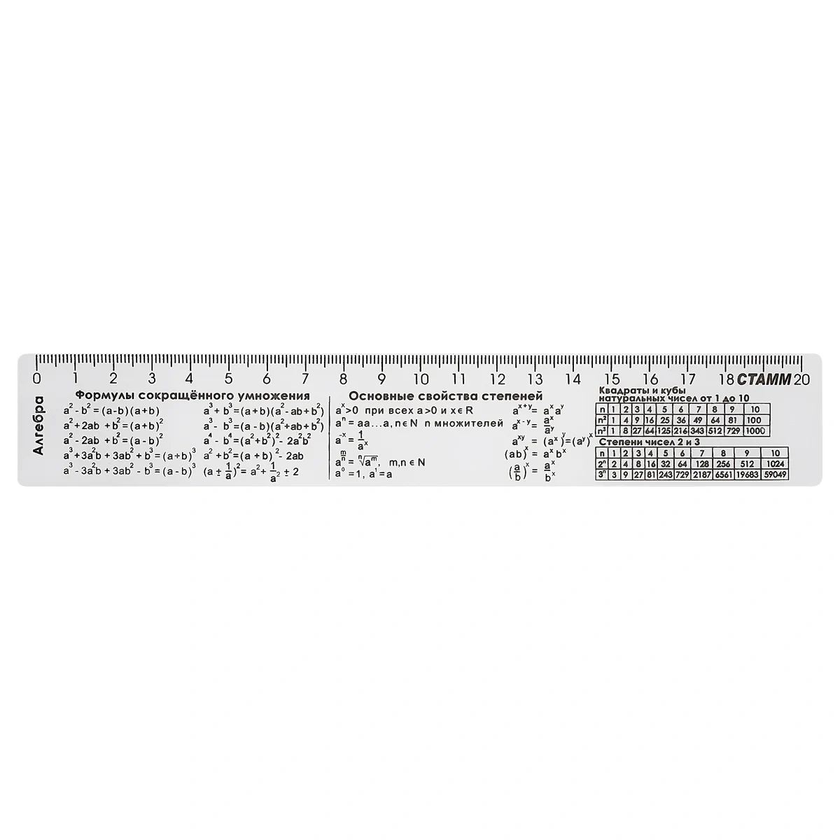 Линейка 20см Стамм со справочным материалом 'Алгебра', пластиковая, прозрачная бесцветная