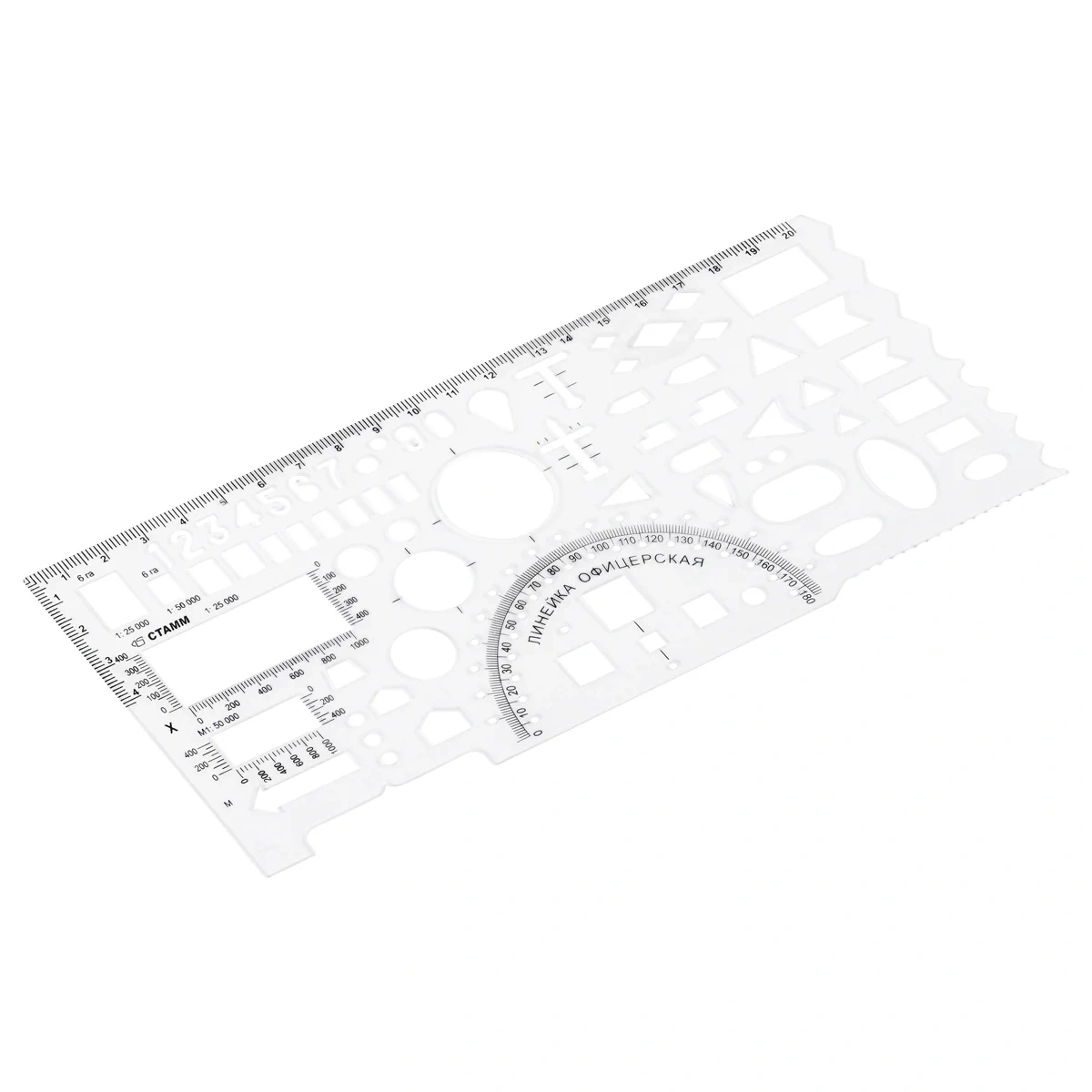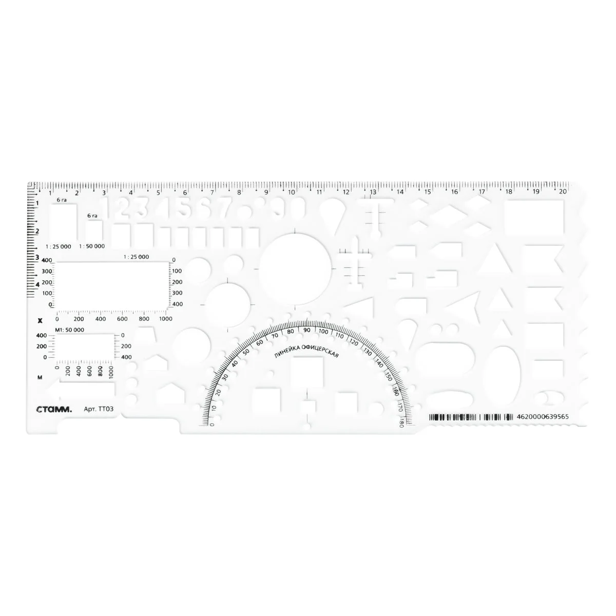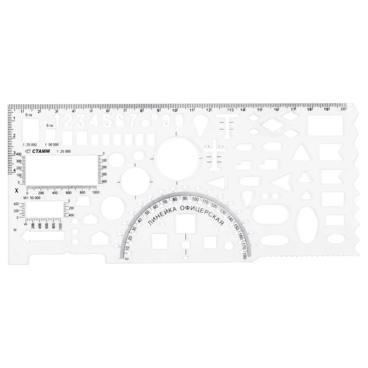 Линейка-трафарет офицерская 20см, с печатной шкалой. Имеет 65 тактических элементов, необходимых для работы с картами. Индивидуальный штрих-код на единице изделия.
