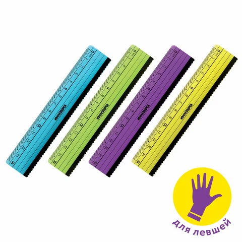 Линейка из яркого тонированного пластика с волнистым краем. Имеет безопасные закруглённые углы. Длина шкалы составляет 15 см. Линейка обладает четкой разметкой, расположенной справа налево, что делает ее удобной в использовании для ЛЕВШЕЙ. Упакована в пластиковый пакет с европодвесом.