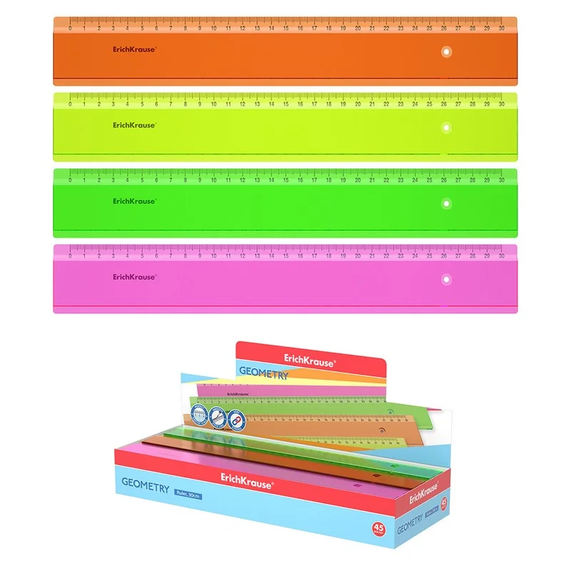 Линейка из высококачественного пластика. Ассорти из 4 ярких прозрачных неоновых цветов в коробке дисплее (розовый, оранжевый, желтый, зеленый). Точная миллиметровая шкала, длина разметки составляет 30 см.