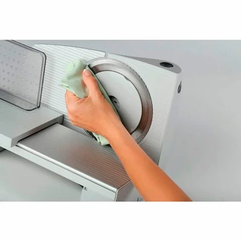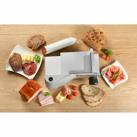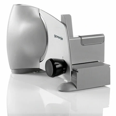 Ломтерезка GORENJE оснащена кнопкой включения и выключения, которая находится на корпусе. Рядом с ней расположена кнопка снятия с предохранителя – эта опция используется для того, чтобы прибор случайно не запустился. При хранении модель всегда ставится в безопасный режим, что позволяет избежать нежелательных происшествий. Кнопки слегка утоплены в корпус и вы можете нащупать их даже при плохом освещении. Регулировка толщины ломтиков осуществляется с помощью поворотной ручки. Можно установить параметр в диапазоне от 0 до 15 мм. За счет этого вы можете как нарезать деликатесы для сэндвичей, так и подготовить продукты для приготовления любого блюда, будь то салат, пирог или картофель фри.