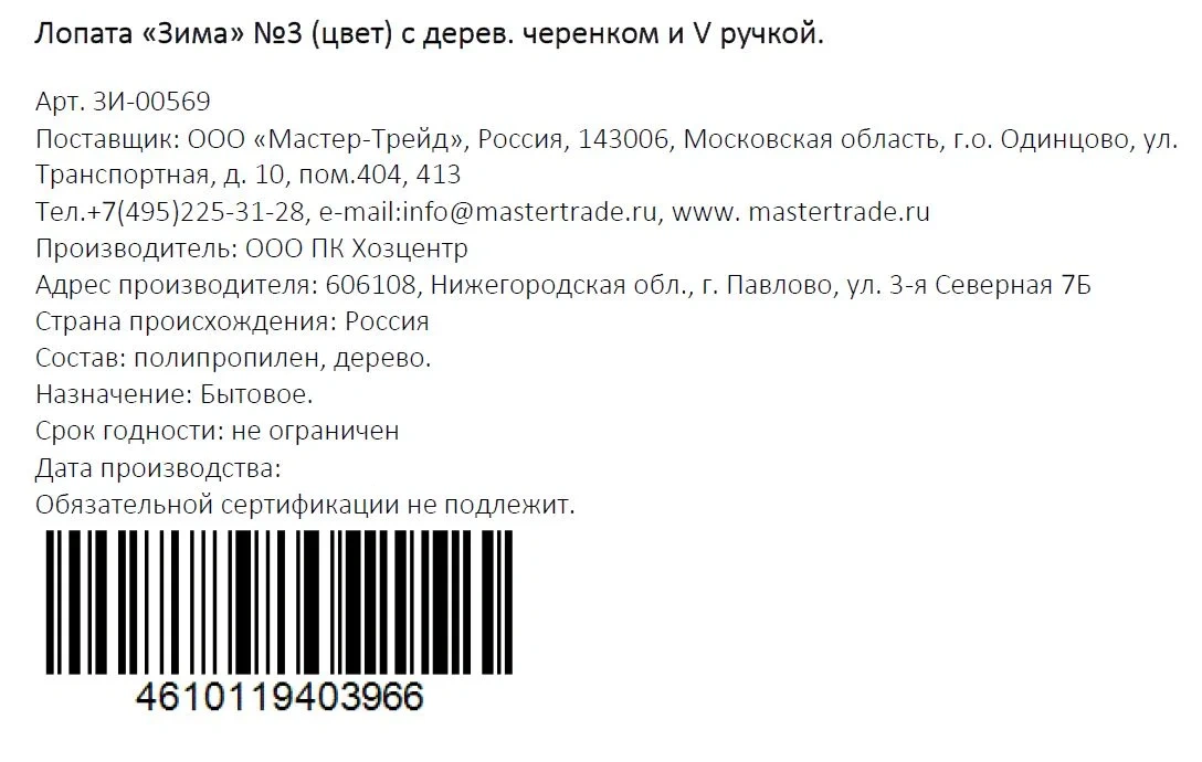 | Комплектация | лопата - 1 шт. |