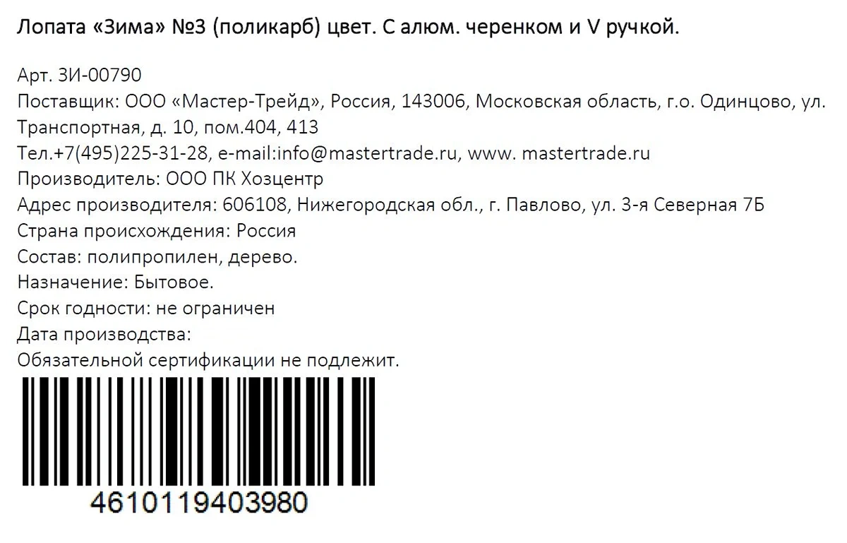 | Комплектация | лопата - 1 шт. |