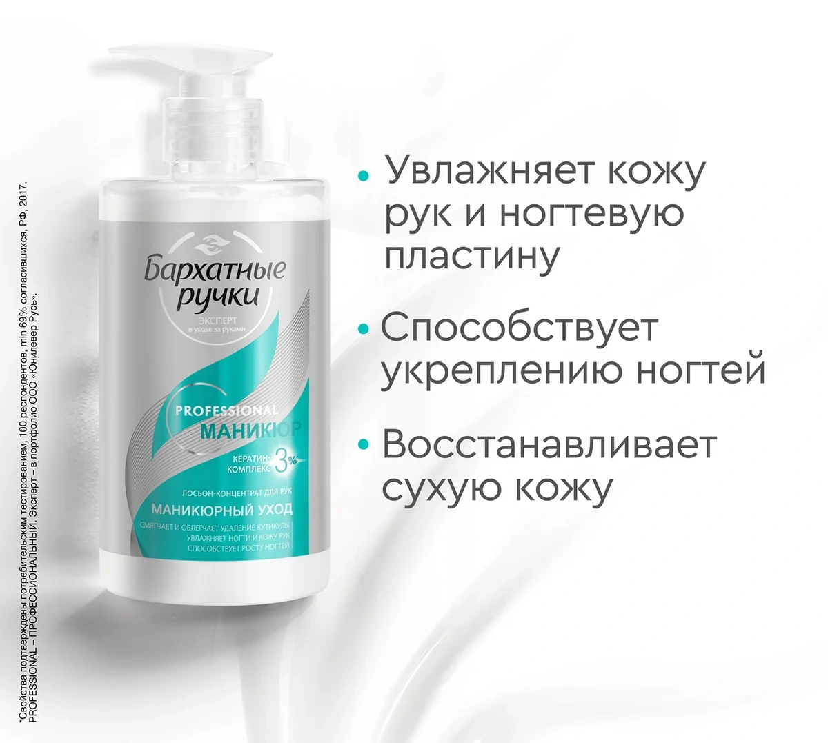 Бренд Бархатные Ручки представляет ухаживающий лосьон-концентрат Маникюрный уход, действие которого идеально подходит для салонной процедуры ухода за руками и ногтями. Он ухаживает за околоногтевой зоной, мгновенно смягчает кутикулу, помогая удалить ее. Формула быстро и полноценно увлажняет кожу рук и ногтевую пластину. Подходит для кожи, склонной к сухости и шелушению. Рекомендован обладателям ломких, склонных к расслоению ногтей.