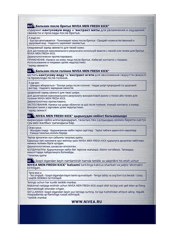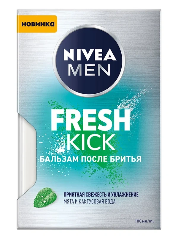 Не хватает свежести? Попробуй новую линейку средств для и после бритья Nivea Fresh Kick с мятой и кактусовой водой! Бальзам после бритья Nivea Fresh Kick содержит кактусовую воду и экстракт мяты для увлажнения и ощущения свежести и прохлады после бритья. А еще он быстро впитывается, тонизирует кожу после бритья, придает коже естественный и здоровый вид, надолго заряжает свежестью. Попробуй ежедневный заряд свежести для твоей кожи и будь естественно свеж вместе с Nivea Fresh Kick! Для достижения максимального результата используй вместе с пеной или гелем для бритья Nivea Fresh Kick.