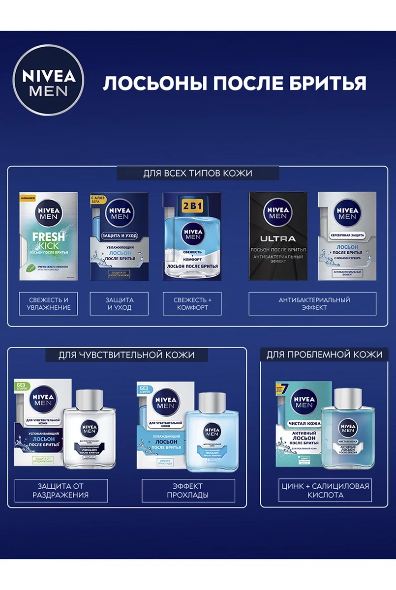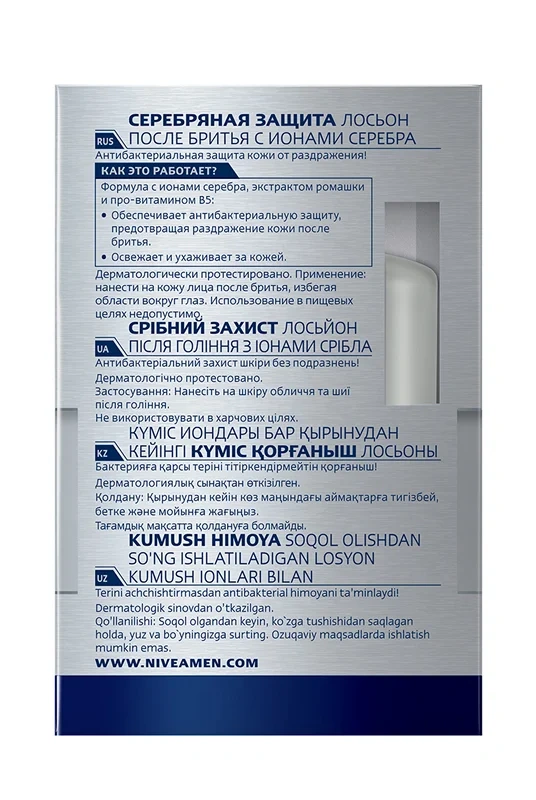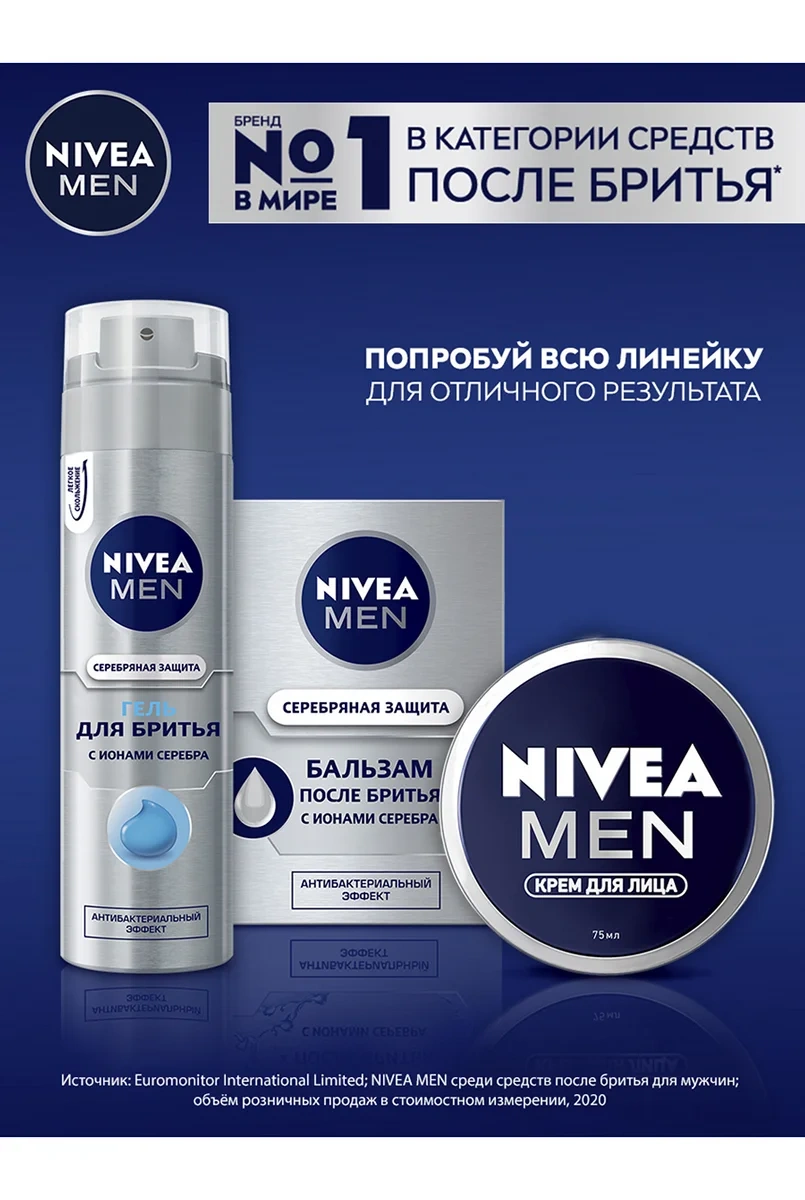 Лосьон после бритья Серебряная защита от Nivea с ионами серебра в составе обладает антибактериальным эффектом и обогащенный экстрактом ромашки и провитамином В5, обеспечивает глубокое увлажнение и питание кожи, обеспечивая защиту от раздражения кожи после бритья. Освежает и успокаивает кожу, имеет приятный мужской аромат. Лосьон подходит для всех типов кожи. Лосьон после бритья быстро освежит кожу, не оставляет жирного блеска. Применение: нанесите на лицо и шею после бритья, избегая кожи вокруг глаз. Для предотвращения дискомфорта во время бритья и после, используйте продукты линейки Nivea Серебряная защита против сухости и воспаления. Испытывайте комфорт без раздражения и сухости кожи после каждого бритья.