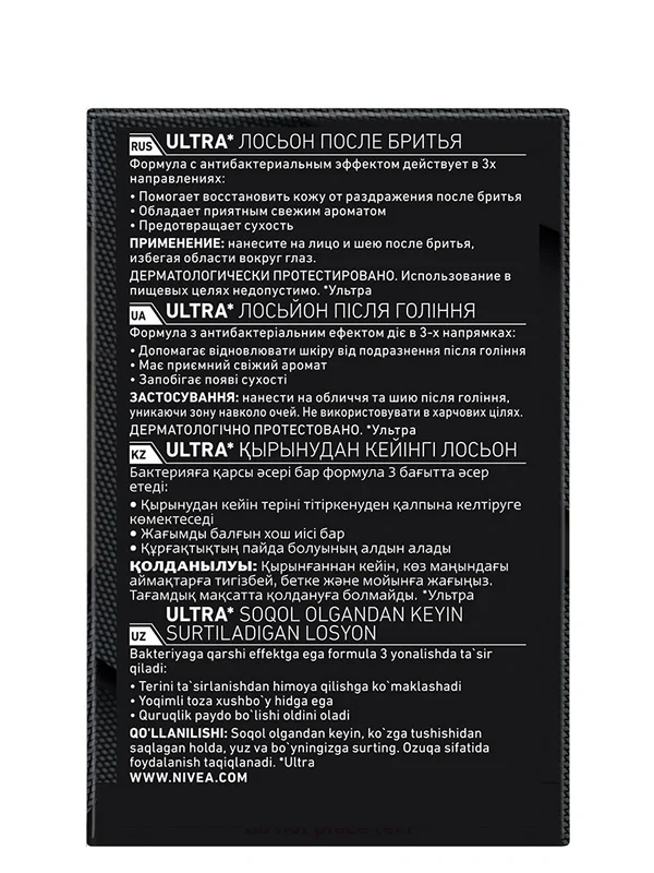 Сухость, зуд и раздражение после бритья хочется исключить из спектра утренних ощущений. Тебе поможет лосьон Nivea Men Ultra. Лосьон после бритья Nivea Men Ultra и его формула с антибактериальным эффектом действует в 3-х направлениях: помогает защищать кожу от раздражения, обладает приятным свежим ароматом, предотвращает появление сухости и шелушения. Освежает и успокаивает кожу, имеет приятный древесный аромат. Антибактериальный эффект оберегает кожу от раздражения. Успокаивающие компоненты предотвращают сухость и зуд. Лосьон после бритья быстро освежит кожу, не оставляет жирного блеска.