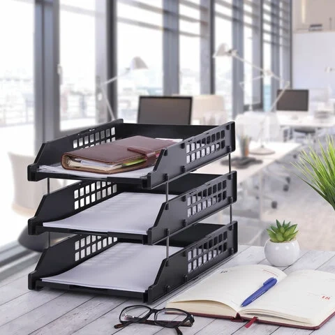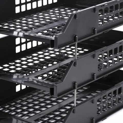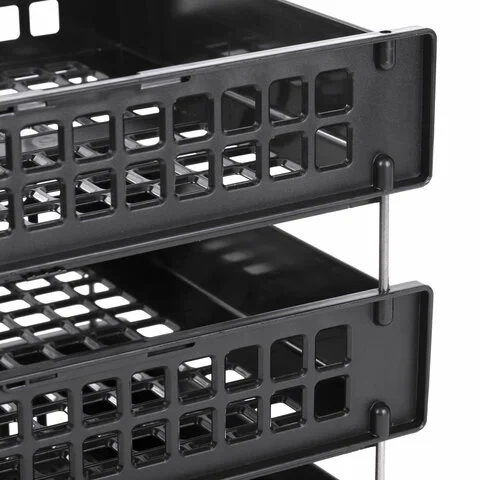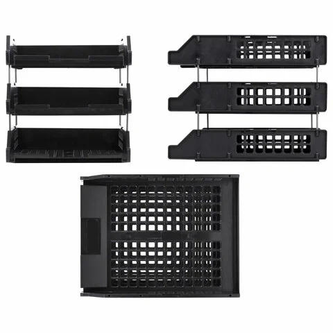 Изготовлены из прочного полистирола. Размер каждого (ГхШхВ) - 334х255х271 мм. Комплект из 3 лотков обладает устойчивой конструкцией, благодаря которой удобен для хранения объемных документов и папок. Выполнены в черном цвете.