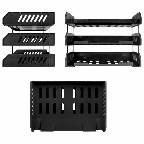 Изготовлены из прочного полистирола. Размер лотков в собранном виде - 335х232х246 мм. Комплект из 3 лотков обладает устойчивой конструкцией, благодаря которой удобен для хранения объемных документов и папок. Выполнены в черном цвете.