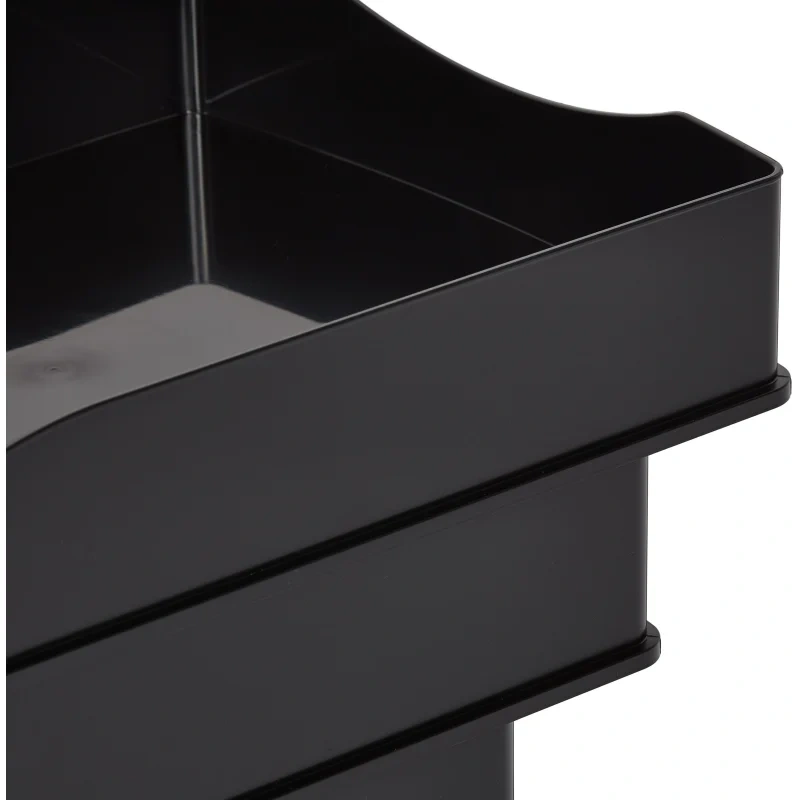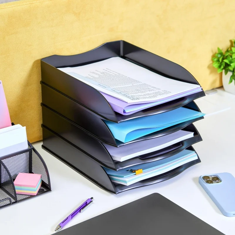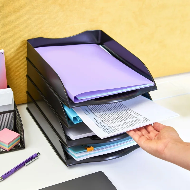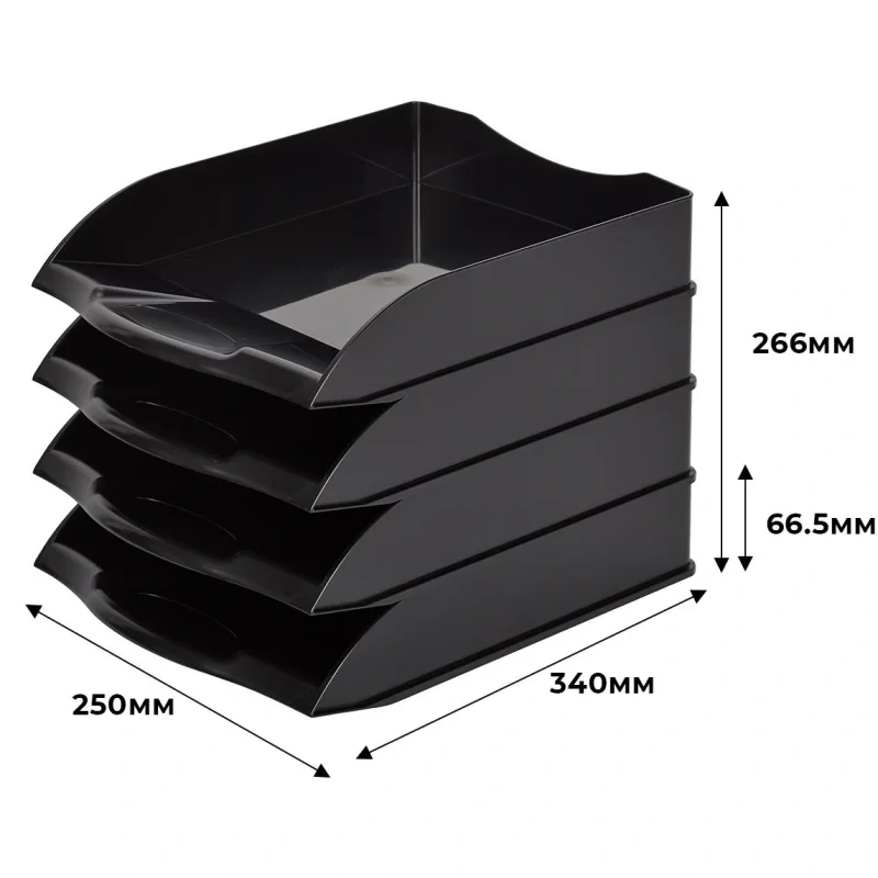 Горизонтальный лоток для бумаг предназначен для хранения и сортировки документов и печатной продукции формата А4. Возможна установка друг на друга и со смещением (штабелирование). Изготовлен из пластика. Цвет: черный. В упаковке 4 лотка. Размеры одного лотка: 66.5×340×250 мм. Высота конструкции: 266 мм. Вес: 1 кг. В комплекте нет этикетки для маркировки.