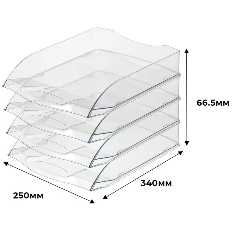 Горизонтальный лоток для бумаг предназначен для хранения и сортировки документов и печатной продукции формата А4. Возможна установка друг на друга и со смещением (штабелирование). Изготовлен из пластика. Цвет: бесцветный. В упаковке 4 лотка. Размеры одного лотка: 66.5×340×250 мм. Высота конструкции: 266 мм. Вес: 1 кг. В комплекте нет этикетки для маркировки.