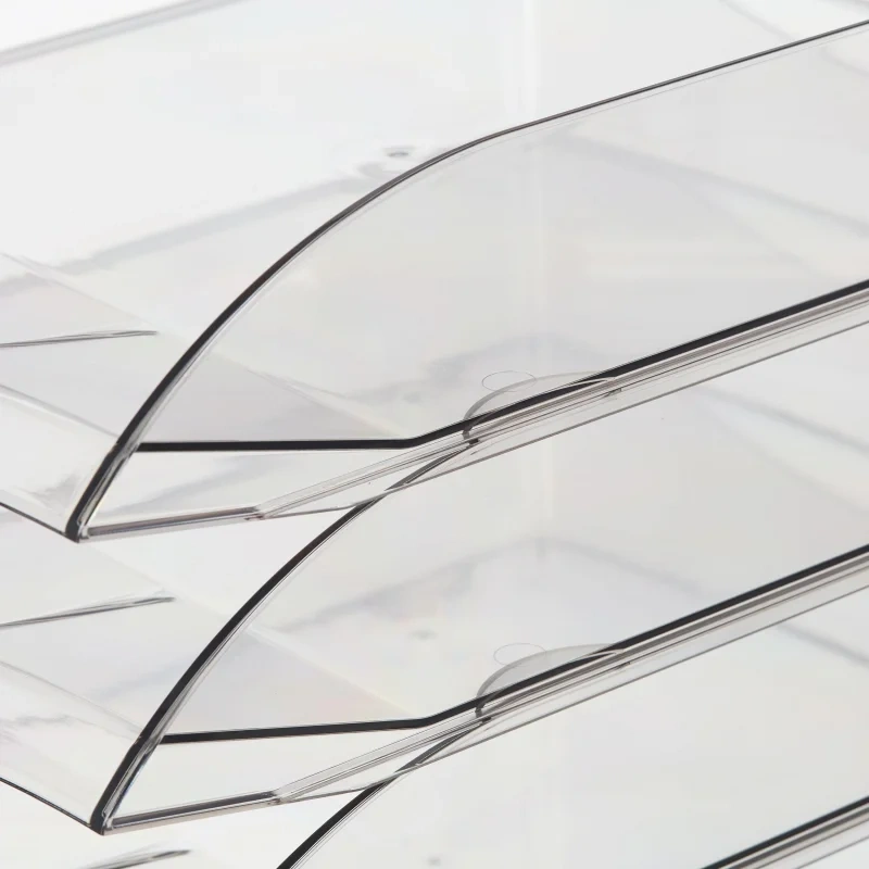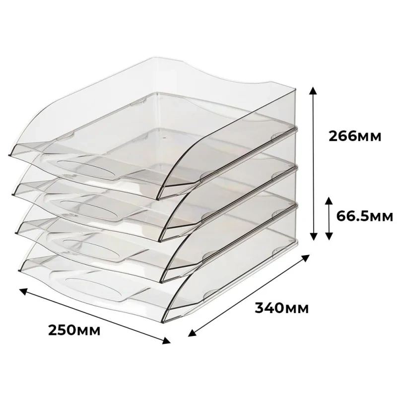 Горизонтальный лоток для бумаг предназначен для хранения и сортировки документов и печатной продукции формата А4. Возможна установка друг на друга и со смещением (штабелирование). Изготовлен из пластика. Цвет: прозрачный тонированный. В упаковке 4 лотка. Размеры одного лотка: 66.5×340×250 мм. Высота конструкции: 266 мм. Вес: 1 кг. В комплекте нет этикетки для маркировки.