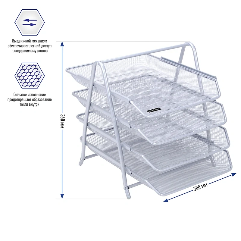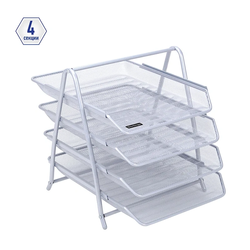 Стильный и практичный горизонтальный лоток с 4 секциями из высококачественного материала. Предназначен для удобного хранения бумажной продукции формата А4. Позволяет легко и эффективно организовать рабочее место. Лотки могут использоваться отдельно от опоры. Выдвижной механизм обеспечивает легкий доступ к содержимому лотков. Легкая и быстрая сборка. Серебристый цвет. Прочный корпус из высококачественного металла. Сетчатое исполнение предотвращает образование пыли внутри. Упаковка в картонную лакированную коробку.