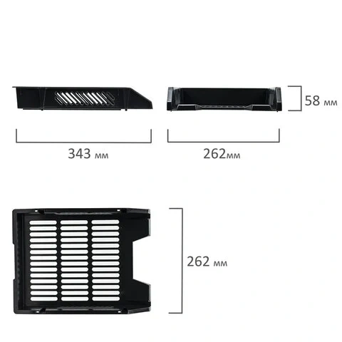 Высота: 267 мм, глубина: 355 мм, ширина: 295 мм. Лотки могут использоваться отдельно от опоры, а при необходимости - быстро и просто собрать обратно. Выдвижной механизм обеспечивает удобный доступ к бумагам.