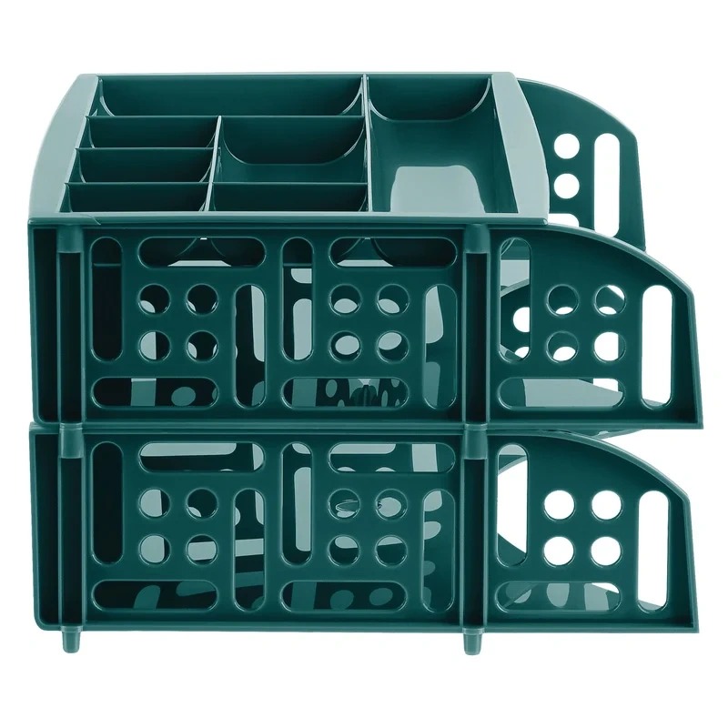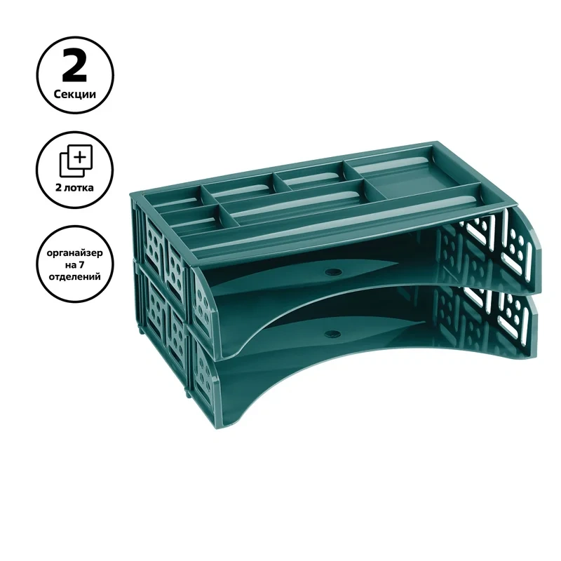 Набор из 2-х лотков и органайзера 'СТАММ' серии 'Field' предназначен для хранения и организации бумажной продукции формата А4 и канцелярских принадлежностей. Эксклюзивный дизайн, прочный, вместительный корпус. Лотки и органайзер надежно устанавливаются друг на друга. Широкая загрузка во фронтальной части лотков облегчает изъятие документов. Органайзер имеет 7 отделений для канцелярских и бытовых принадлежностей. Изделие высотой 150мм, глубиной 225мм и длиной 335мм изготовлен из качественного пластика. Вмещает 1000 листов. Цвет набора - зеленый.