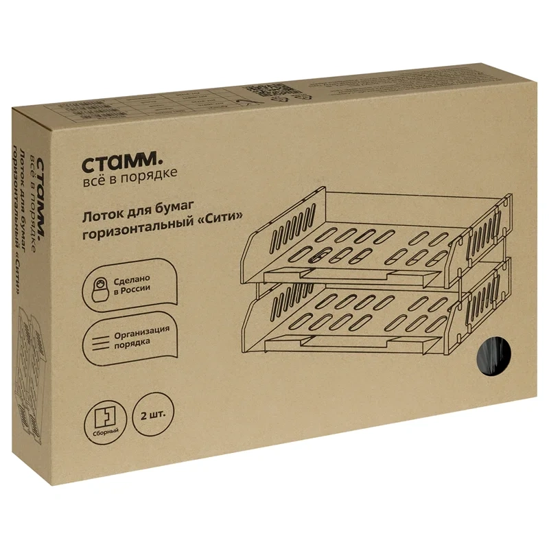 Набор из 2-х горизонтальных лотков СТАММ серии 'Сити' предназначен для хранения бумажной продукции формата А4. Габариты изделия — 154*232*334 мм. Широкая загрузка во фронтальной части лотков облегчает изъятие документов. Прочный, устойчивый, вместительный корпус. Лотки надежно фиксируются друг на друге металлическими стержнями. Изготовлен из качественного полистирола. Упакован в картонную коробку, поставляется в разобранном виде. Цвет лотков - черный.