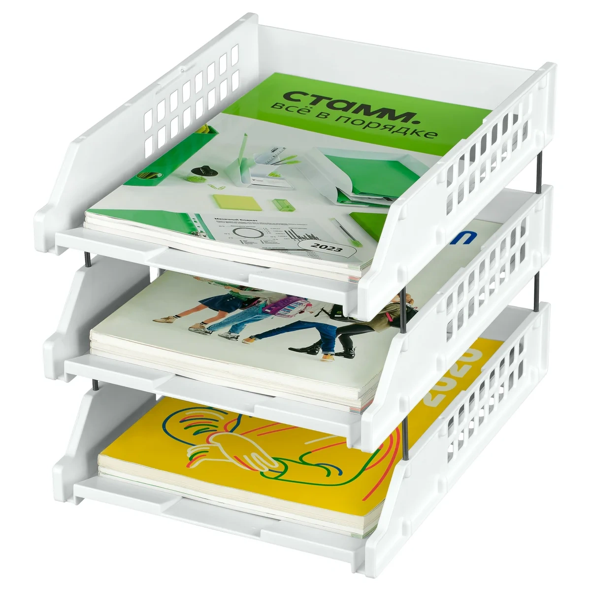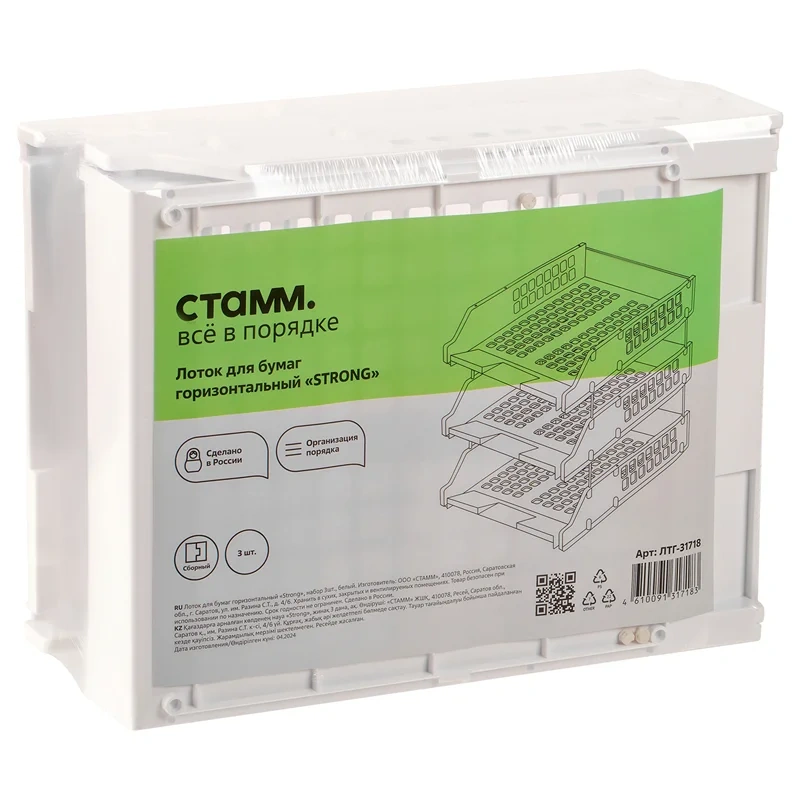 Набор из трёх горизонтальных лотков СТАММ Strong предназначен для удобного хранения и организации бумаг формата А4. Благодаря прочной конструкции, состоящей из металлических стержней, лотки надёжно соединяются друг с другом и вмещают до 1 350 листов. Возможность установки верхнего лотка под углом 90 градусов обеспечивает дополнительное удобство использования. Изготовленные из качественного полистирола, изделия обладают прочным и устойчивым корпусом. Поставляются в термоусадочной плёнке в разобранном виде. Цвет лотков — белый.