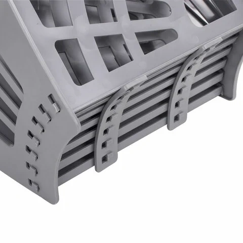 Изготовлен из пластика серого цвета. Размер собранного лотка с 6 отделениями - 300х235х320 мм. Упакован в термоусадочную пленку, поставляется в компактном разобранном виде.
