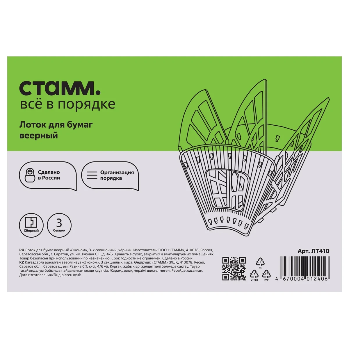 Лоток СТАММ серии 'Эконом' 3-х секционный 2 отделения для бумаг формата А4 предназначен для хранения и систематизации бумажной продукции. Конструкция предусматривает возможность горизонтального и вертикального расположения. Регулируемая ширина отделений. Прочный, легкий, вместительный корпус. Изготовлен из качественного пластика. Упакован в термоусадочную пленку, поставляется в разобранном виде. Цвет лотка - черный. Изделие высотой 305мм, шириной 320мм, глубиной 235мм вмещает до 600 листов.