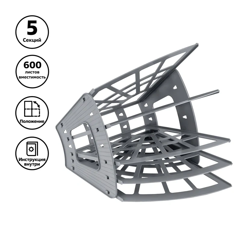 Лоток секционный 5 секций, 4 отделения для документации формата А4. Возможность горизонтального и вертикального расположения. Сборно-разборная, прочная, лёгкая конструкция. Конструкция позволяет регулировать ширину отделений. Экономичен при транспортировке и хранении.