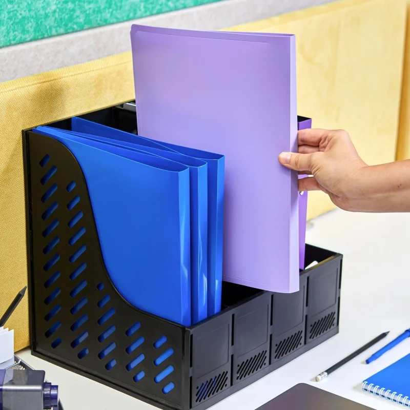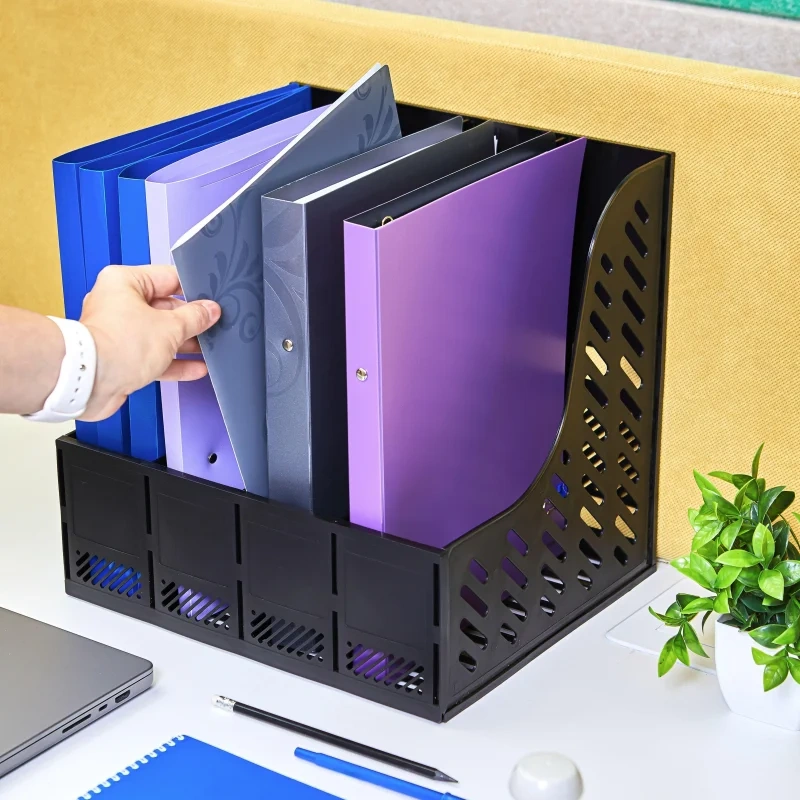 Вертикальный накопитель Attache выполнен из прочного пластика черного цвета. Минималистичный дизайн лотка создаст на Вашем рабочем месте ощущение легкости. Не занимает много места на рабочем столе. Позволяет удобно хранить и систематизировать документы и печатную продукцию формата А4. Имеет 4 отделения равной ширины. Размеры изделия (ДxШxВ): 310×370×310 мм. Вес: 560 г. Конструкция требует самостоятельной сборки. Удобен для хранения большого объема документов. В комплекте есть этикетка для маркировки. Количество в транспортном коробе — 10 штук.