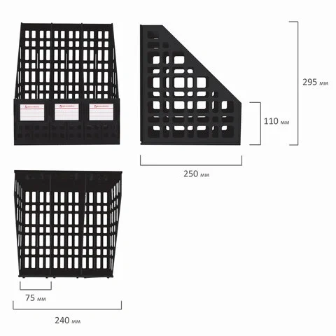 Выполнен в черном цвете с тремя отделениями. Предназначен для хранения каталогов и папок. Представляет собой прочную устойчивую сборную конструкцию с сетчатыми боковыми стенками. Размеры: высота - 295 мм, ширина - 240 мм, глубина - 250 мм.