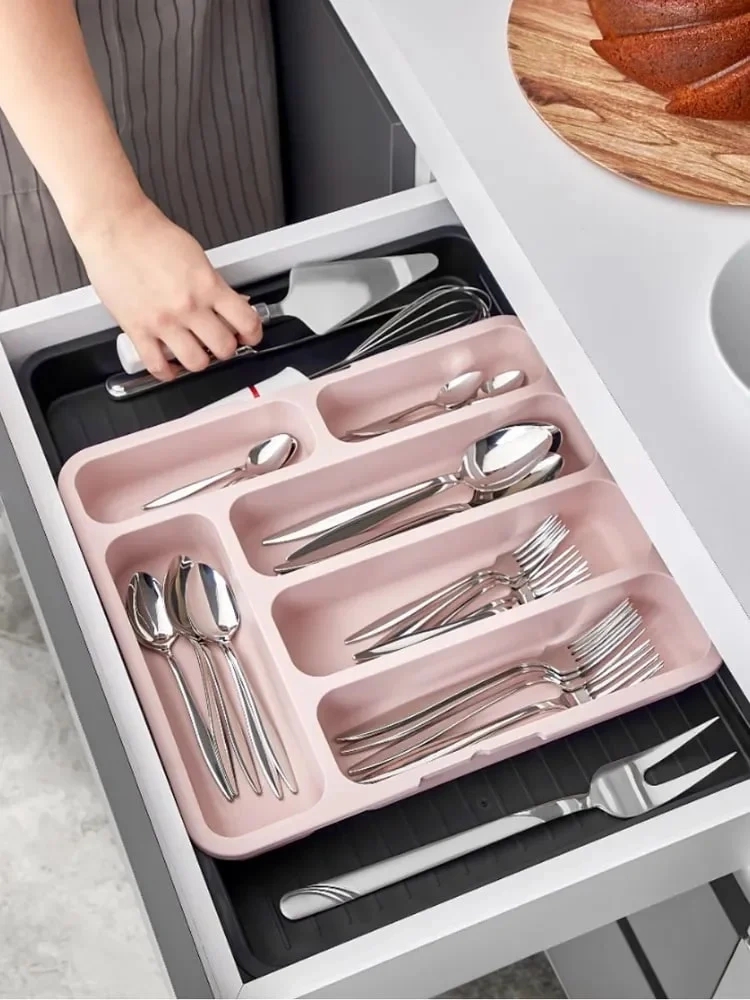 Лоток Gondol для столовых приборов раздвижной розовый — отличное решение для оптимизации пространства на вашей кухне. С его помощью вы сможете организовать хранение любых столовых приборов: вилок, ложек, ножей. А также предотвратите попадание пыли, крошек и влаги на предметы. Так в процессе приготовления пищи или сервировки все необходимое всегда будет у вас под рукой. Ведь нередко отыскать в нужный момент определенную вилочку или ложечку в большом общем ящике бывает крайне сложно и затратно по времени. Лоток сформирован из 5 отсеков, по которым удобно распределять кухонную утварь. За счет противоскользящего внутреннего покрытия вилки/ложки не скользят, не гремят, когда вы открываете или закрываете ящик. Изделие выполнено в приятной цветовой гамме из прочного пластика. Этот материал отличается высокой гигиеничностью, прочность и экологичностью. Устойчив к механическим повреждениям, не выделяет неприятного запаха и абсолютно безопасен для здоровья человека. К тому же совершенно нетребователен в уходе. Мыть пластиковый лоток можно вручную или с помощью посудомоечной машины с использованием обычных средств для мытья посуды. После мытья достаточно дать изделию высохнуть или насухо протереть кухонным полотенцем, а затем снова установить в ящик.