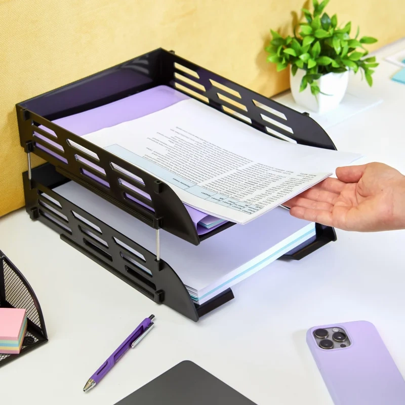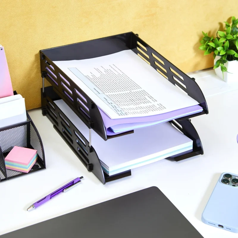 Горизонтальный лоток для бумаг выполнен из пластика черного цвета, предназначен для хранения документов и печатной продукции формата А4. Этот лоток освежит рабочий стол благодаря дизайну и яркой палитре. Установка лотков друг на друга на металические стержни. Изготовлен из полистирола. Цвет: черный. Размеры в сборе (ВхГхШ): 160×330×245 мм. Вес 0.620 кг.