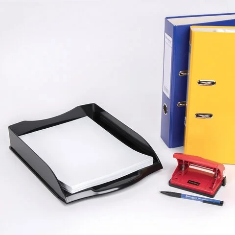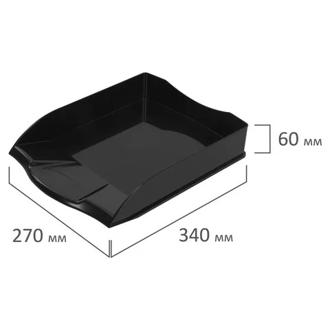 Изготовлен из прочного черного полистирола. Размер (ГхШхВ) - 340х270х60 мм. Обладает устойчивой конструкцией, благодаря которой удобен для хранения объемных документов и папок.