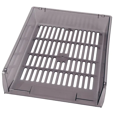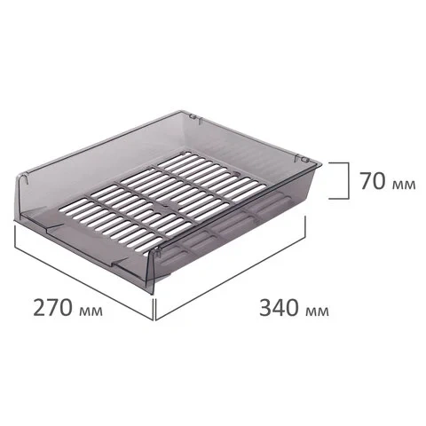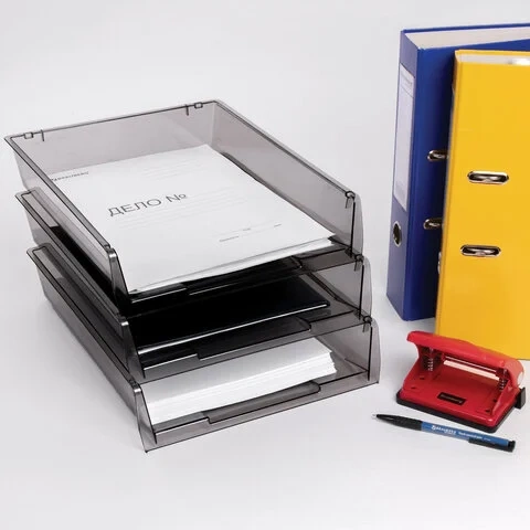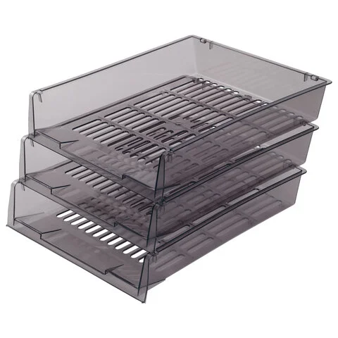 Изготовлены из прочного полистирола. Размер каждого (ГхШхВ) - 340х270х70 мм. Комплект из 3 лотков обладает устойчивой конструкцией, благодаря которой удобен для хранения объемных документов и папок. Выполнен в тонированном сером цвете. Поставляется в гофрокоробе.