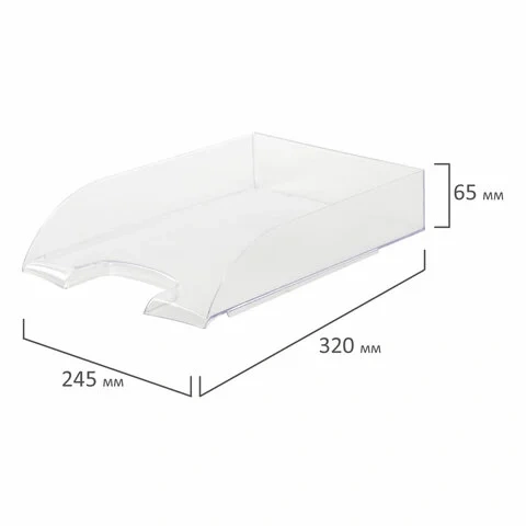 Изготовлен из прочного прозрачного полистирола. Размер (ГхШхВ) - 320х245х65 мм. Обладает устойчивой конструкцией, благодаря которой удобен для хранения объемных документов и папок.