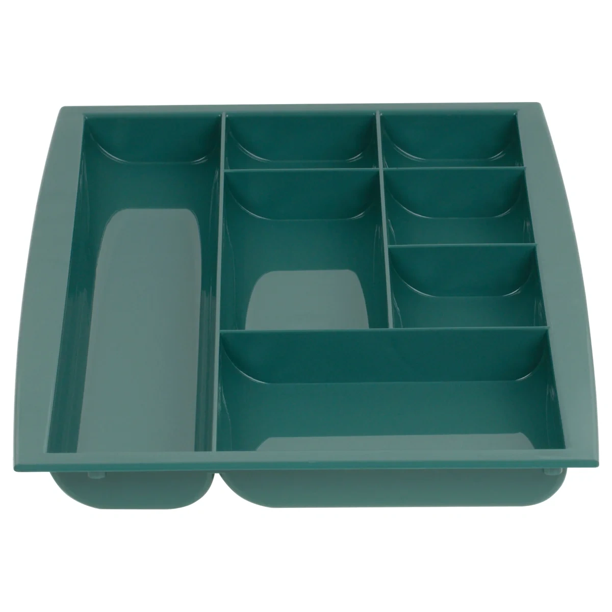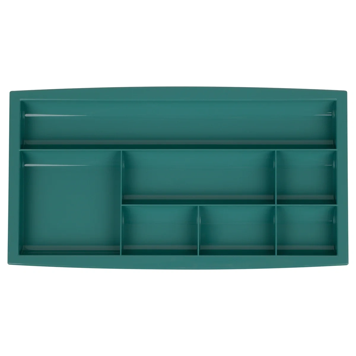 Настольная подставка 'СТАММ' серии 'Field' предназначена для хранения канцелярских принадлежностей и бытовых мелочей. Изделие высотой 2 см, длиной 33,5 см и шириной 18,2 см подходит для размещения в ящике рабочего стола. Имеет 7 отделений разных размеров. Подставка изготовлена из качественного пластика. Цвет изделия - зеленый.
