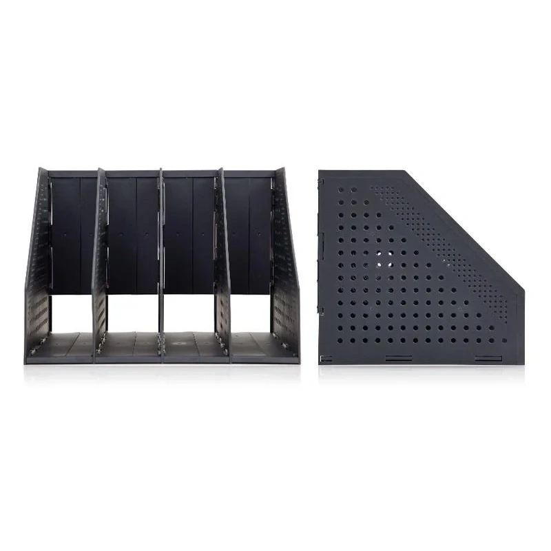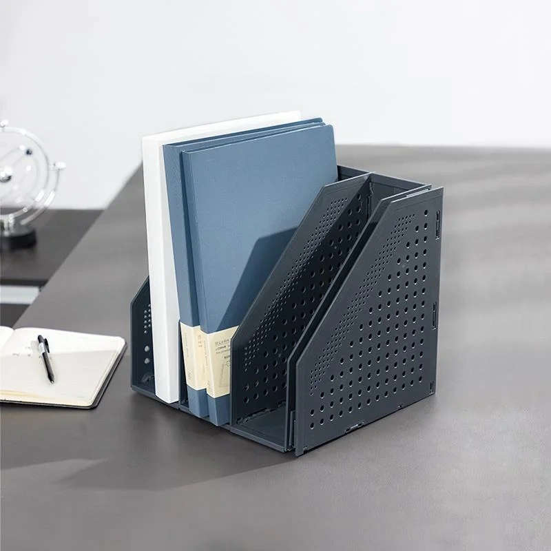 Складной вертикальный накопитель Deli темно-серого цвета для хранения каталогов, бумаг, документов и папок формата А4. Выполнен из прочного и высококачественного пластика. Стильный дизайн накопителя придаст Вашему рабочему месту изысканность и элегантность. Содержит 4 отделения, которые позволяют структурировать документы и быстро найти нужный файл. Вертикальный накопитель для бумаг удобно хранить на столе, он не займет много места. Размеры изделия: 332×256×243 мм. Вес: 1003 г. Обладает устойчивой конструкцией. Органайзер для бумаг продается уже в собранном виде.
