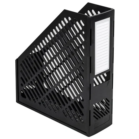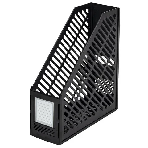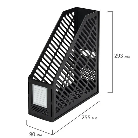 Выполнен в черном цвете, с одним отделением и с табличкой для маркировки. Предназначен для хранения бумаг формата А4. Представляет собой устойчивую разборную конструкцию с сетчатыми поверхностями. Размеры: высота - 293 мм, ширина - 90 мм, глубина - 255 мм.