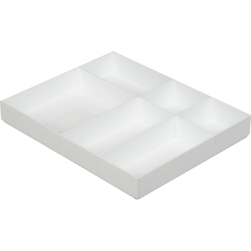 Лоток на шесть отделений для вкладки в бокс или ящик стола. Предназначен для хранения документов, канцелярских принадлежностей, денежных купюр или иной продукции. Изготовлен из качественного плотного белого пластика полистирола. Размеры: 315×255×40 мм. Размер отделений (ШхГ): первый ряд 140×165 мм и две по 80×165 мм; второй ряд 140×80 мм и две по 80×80 мм. Вес: 400 г. Поставляется в защитной пленке. В комплекте нет этикетки для маркировки.