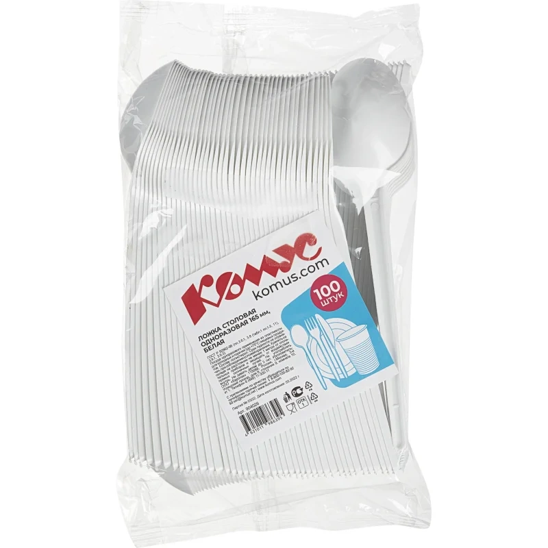 Ложка одноразовая столовая Комус Эконом белая 165 мм 100 штук в упаковке. Одноразовые столовые ложки Комус подходят как для холодных, так и для горячих напитков. Используются на предприятиях общественного питания, в дороге, на пикнике, в домашнем и офисном обиходе. Для изготовления использован высококачественный полистирол белого цвета, благодаря чему они легкие и не травмоопасные. Максимальная температура используемых пищевых продуктов +70С. Длина - 165 мм. В упаковке 100 штук, в транспортном коробе 28 упаковок. Товар произведен под контролем ''Комус''. Мы специально позаботились о Партнерах, которые превыше всего ценят качество и комфорт и разработали линейку Одноразовой посуды самых востребованных размеров для обеспечения быстрого питания в офисе, образовательных и производственных учреждениях, сферы гостеприимства и общественного питания и многих других. Производство расположено в России, что гарантирует постоянный контроль качества и оптимальные цены.