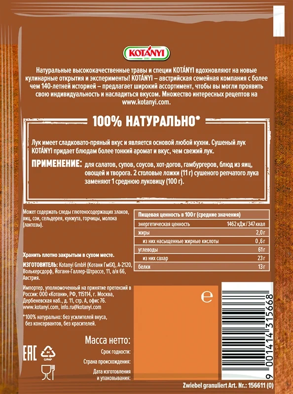 Натуральный лук, высушенный по особой бережной технологии. Имеет сладковато-пряный вкус и является неотъемлемым ингредиентом любой кухни. Прекрасно подходит для мясных, овощных и рыбных блюд, салатов, супов, соусов, хот-догов, гамбургеров. Сушеный лук не требует дополнительной обработки перед использованием, что существенно сократит время приготовления блюда.