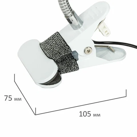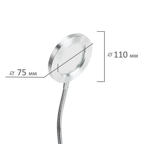 Корпус изделия изготовлен из металла. Крепится к поверхности при помощи прищепки. Гибкая ножка, несколько углов вращения. Регулируемый угол наклона. Увеличение линзы 3х, диаметр 75 мм. Светодиодная подсветка расположена по всему диаметру линзы. Подключается устройство к источнику питания при помощи USB-кабеля. Длина кабеля питания - 2 м. Длина гибкой ножки - 38 см, максимальная ширина захвата крепежной прищепки - 11 см, диаметр линзы с оправой - 11 см.