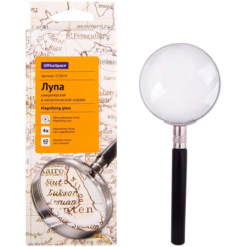 Лупа Officespace увеличение х4, D=60мм, металлическая оправа