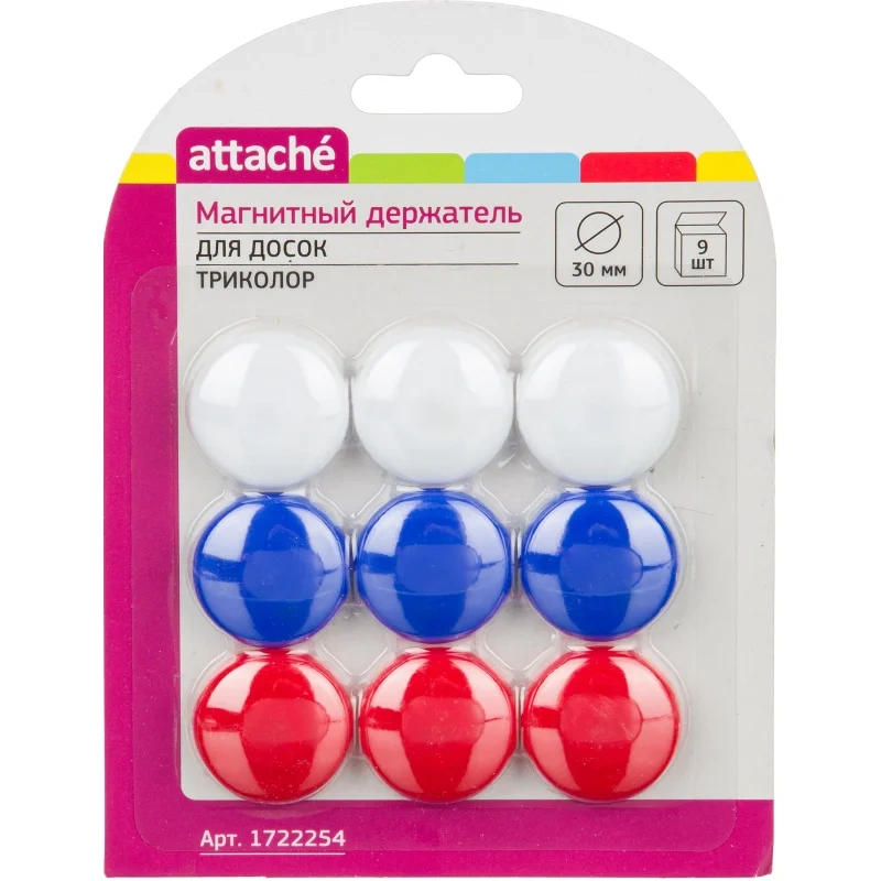 Магнитный держатель Attache для досок Триколор 30 мм,9 шт/уп ассорти Магнитные держатели для досок Attache Триколор предназначены для фиксирования информации на металлических поверхностях магнитно-маркерных досок, флипчартов или витрин. Диаметр магнитов 30 мм. Поставляются по 9 штук в упаковке. Цвет изделий-ассорти.