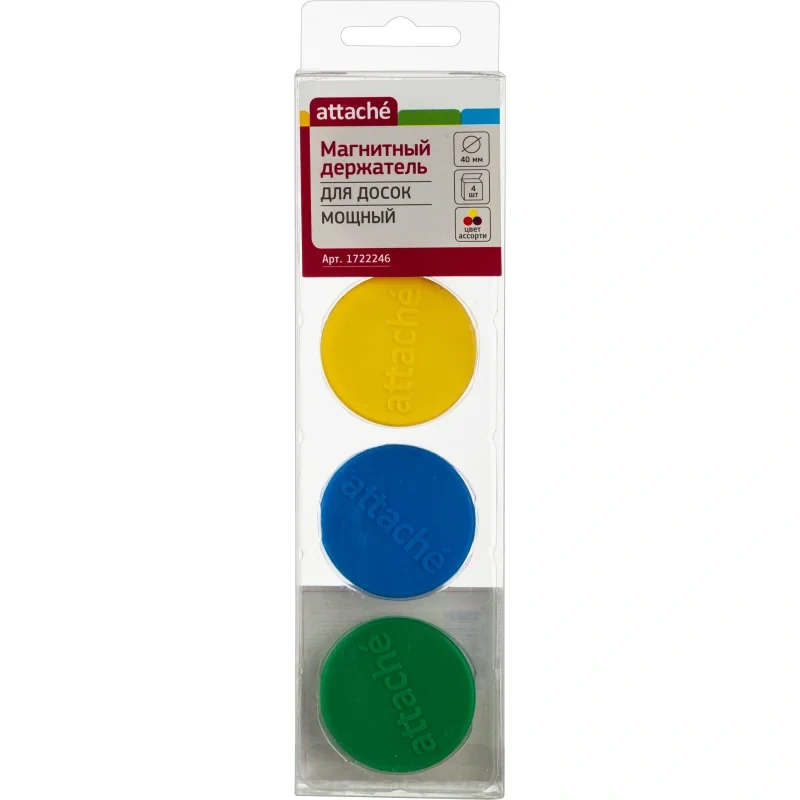 Магнитный держатель МОЩНЫЙ Attache,40 мм,4 шт/уп ассорти Магнитный держатель мощный Attache для досок, диаметром 40 мм, в количестве 4 штук в упаковке, ассорти. Надежно удерживаются на любой железной или стальной поверхности.