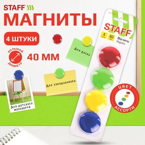 Магниты БОЛЬШОГО ДИАМЕТРА, 40 мм, НАБОР 4 штуки, цвет АССОРТИ, в блистере, STAFF 'Basic', 237484