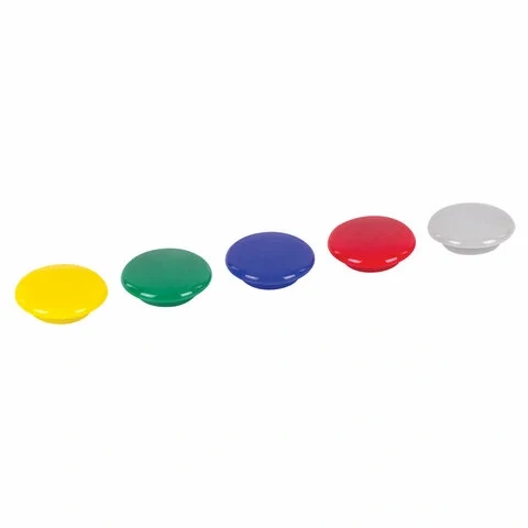 Диаметр магнита составляет 30 мм. 5 штук в комплекте. Разноцветные магниты помогут надежно прикрепить листы бумаги к магнитно-маркерной поверхности досок, витрин и флипчартов. Надежно удерживаются на любой железной или стальной поверхности. Поставляются в удобной блистерной упаковке с европодвесом.