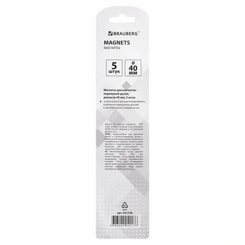 Диаметр магнита составляет 40 мм. 5 штук в комплекте. Разноцветные магниты помогут надежно прикрепить листы бумаги к магнитно-маркерной поверхности досок, витрин и флипчартов. Надежно удерживаются на любой железной или стальной поверхности. Поставляются в удобной блистерной упаковке с европодвесом.