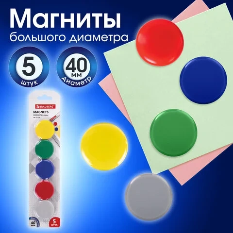 Магниты Brauberg d=40 мм, ассорти, 5шт