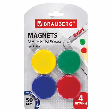 Магниты Brauberg d=50 мм, ассорти, 4шт