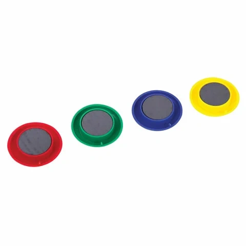 Диаметр магнита составляет 50 мм. 4 штуки в комплекте. Разноцветные магниты помогут надежно прикрепить листы бумаги к магнитно-маркерной поверхности досок, витрин и флипчартов. Надежно удерживаются на любой железной или стальной поверхности. Поставляются в удобной блистерной упаковке с европодвесом.