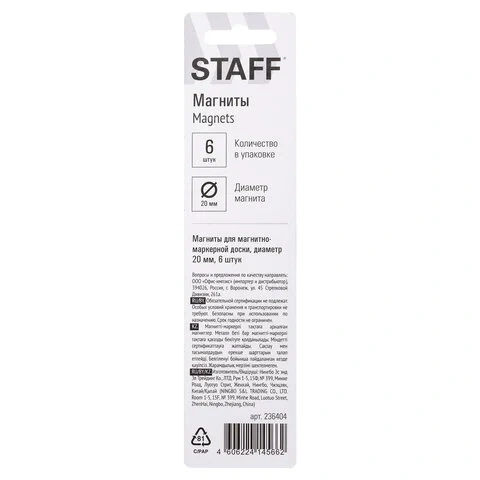 Магниты Staff d=20 мм, 6шт/уп, ассорти