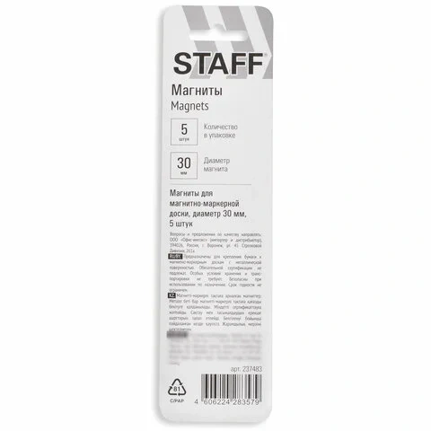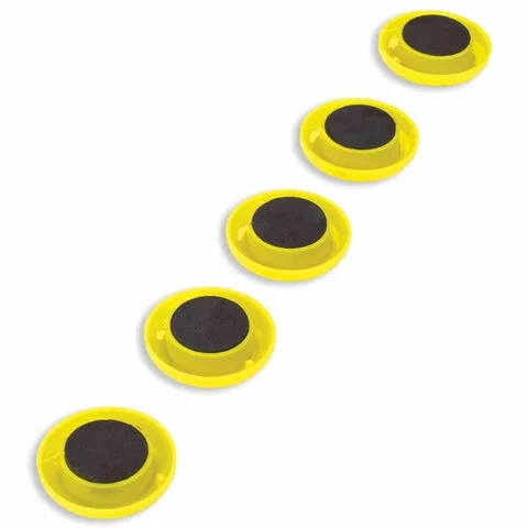 Диаметр магнита составляет 30 мм. 5 штук в комплекте. Качественные магниты помогут надежно прикрепить листы бумаги к магнитно-маркерной поверхности досок, витрин и флипчартов. Надежно удерживаются на любой железной или стальной поверхности. Поставляются в удобной блистерной упаковке с европодвесом.
